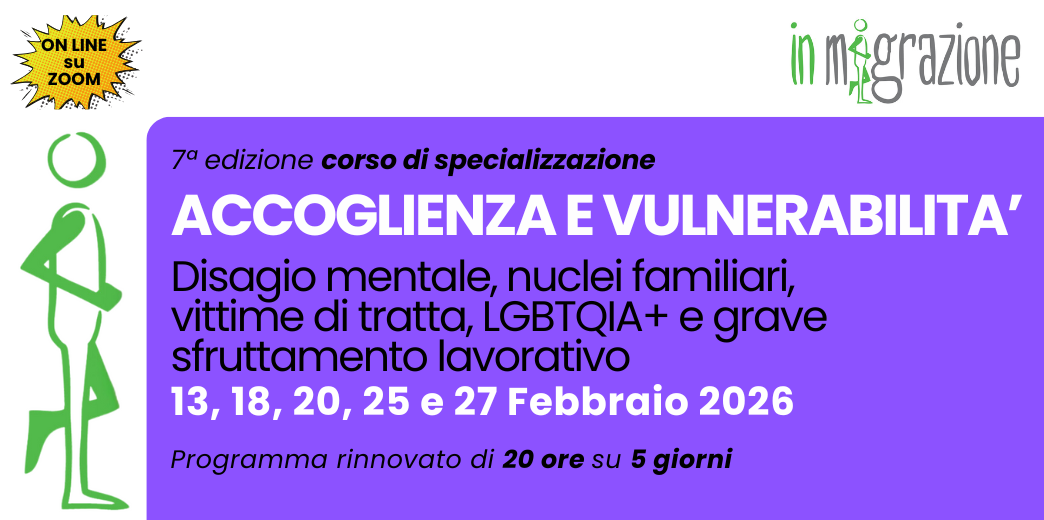 Aperte le iscrizioni alla SETTIMA edizione del Corso di formazione specialistica On Line dedicato a tutti coloro che lavorano (assistenti sociali, educatori, mediatori culturali, psicologi, operatori sociali e per l’integrazione ecc.) in progetti di accoglienza per richiedenti e beneficiari di protezione internazionale, con particolare riferimento ai progetti SAI (ex SIPROIMI-SPRAR), ai Centri di Accoglienza Straordinaria (CAS) e agli sportelli territoriali attivati dal privato sociale e dalle Istituzioni.