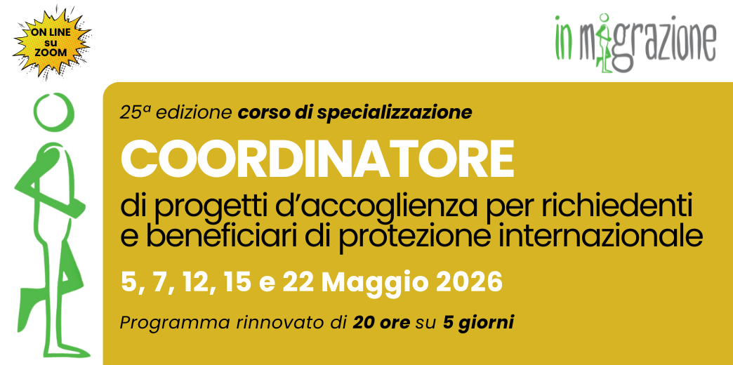 Aperte le iscrizioni alla 25ª edizione del Corso di specializzazione per coordinatori di progetti di accoglienza (strutture collettive e accoglienza diffusa) dedicati a richiedenti e beneficiari di protezione internazionale, con particolare riferimento ai progetti SAI (ex SIPROIMI-SPRAR) e ai Centri di Accoglienza Straordinaria (CAS).