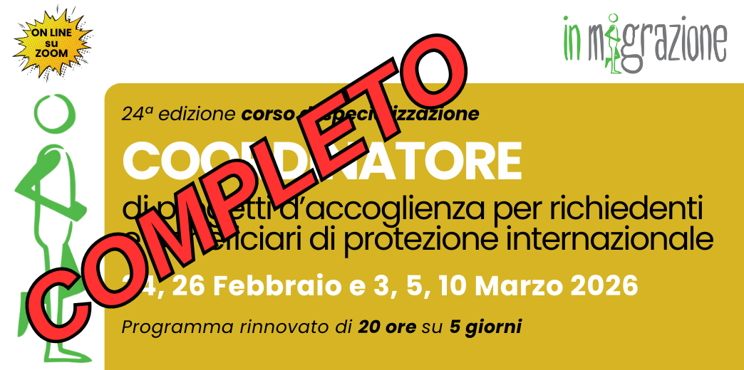 COMPLETO Aperte le iscrizioni alla 24ª edizione del Corso di specializzazione per coordinatori di progetti di accoglienza (strutture collettive e accoglienza diffusa) dedicati a richiedenti e beneficiari di protezione internazionale, con particolare riferimento ai progetti SAI (ex SIPROIMI-SPRAR) e ai Centri di Accoglienza Straordinaria (CAS).