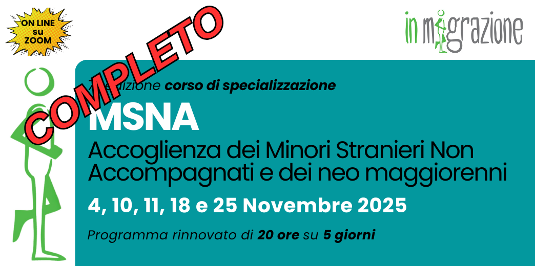 POSTI ESAURITI Aperte le iscrizioni per la SETTIMA edizione del corso di formazione specialistico dedicato a tutti coloro che operano, o che intendono operare, nella relazione d’aiuto rivolta ai MSNA - Minori Stranieri Non Accompagnati e ai Neo-maggiorenni nelle Comunità per minori, nei progetti di accoglienza (SAI, CAS, ecc.) e negli sportelli territoriali.