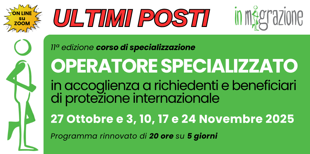 Aperte le iscrizioni al CORSO PER OPERATORI E OPERATRICI DELL'ACCOGLIENZA - 11ª EDIZIONE - impegnati nella relazione d’aiuto in progetti per richiedenti e beneficiari di protezione internazionale, con particolare riferimento ai progetti SAI (ex SIPROIMI-SPRAR) e ai Centri di Accoglienza Straordinaria (CAS).