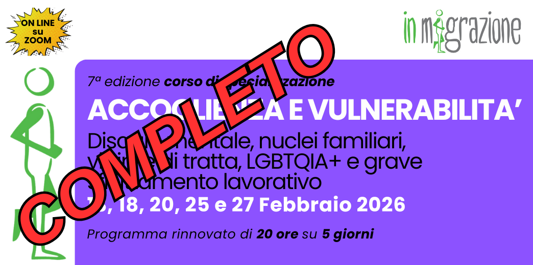 Posti esauriti Aperte le iscrizioni alla SETTIMA edizione del Corso di formazione specialistica On Line dedicato a tutti coloro che lavorano (assistenti sociali, educatori, mediatori culturali, psicologi, operatori sociali e per l’integrazione ecc.) in progetti di accoglienza per richiedenti e beneficiari di protezione internazionale, con particolare riferimento ai progetti SAI (ex SIPROIMI-SPRAR), ai Centri di Accoglienza Straordinaria (CAS) e agli sportelli territoriali attivati dal privato sociale e dalle Istituzioni.